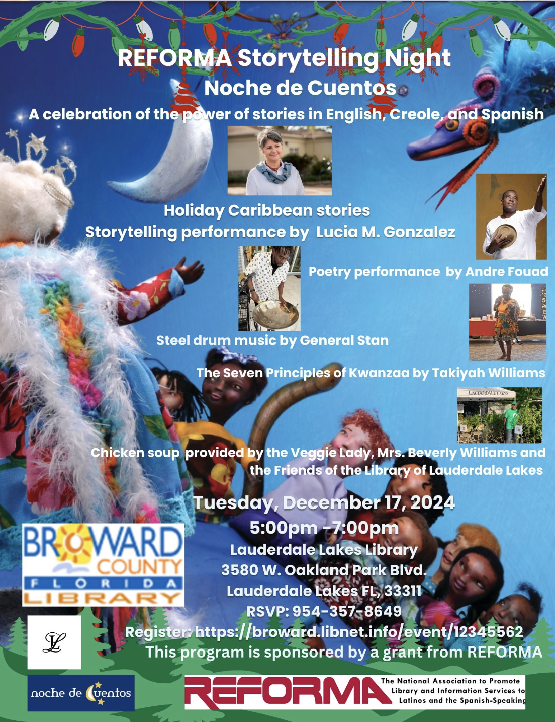 One of the libraries that received a MiniGrant for a Noche de Cuentos programs in 2024 was the Broward County Library System in Broward, Florida. More specifically, the Lauderdale Lake Branch, whose Manager/Senior Librarian is Freda Mosquera, who applied and received the grant from REFORMA.